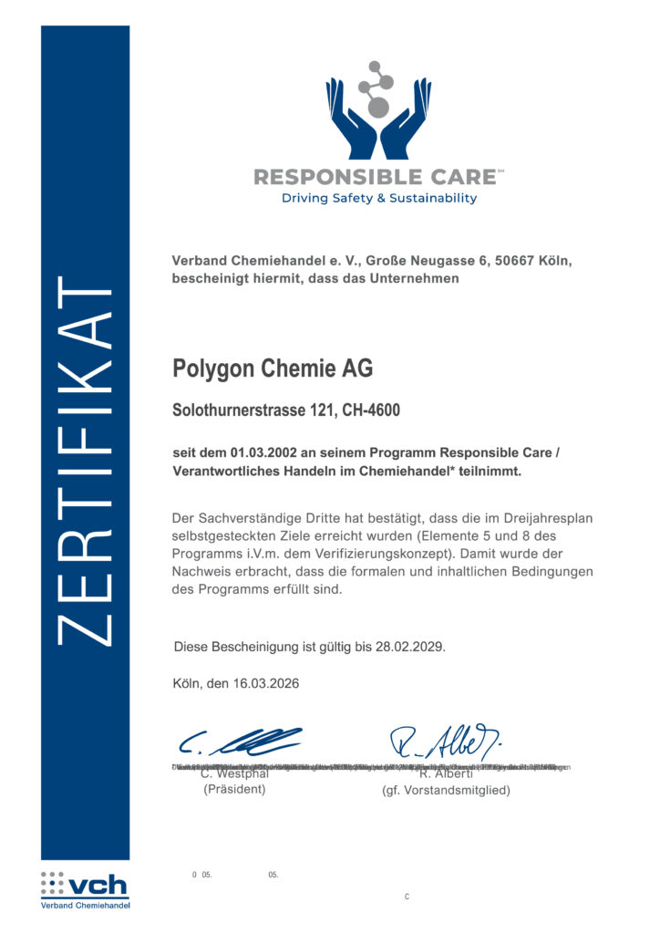 Nachhaltigkeit verstehen wir bei Polygon Chemie AG nicht als Einzelmassnahme, sondern als ganzheitlichen Ansatz unserer Unternehmensführung – im Umgang mit Umwelt, Mitarbeitenden, Geschäftspartnern und der gesamten Lieferkette.